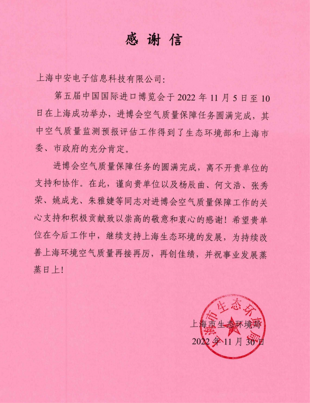 上海環監中心就中安科技在21年國際進博會空氣質量監測預報工作中杰出貢獻送來感謝信!(2021/12/31)
